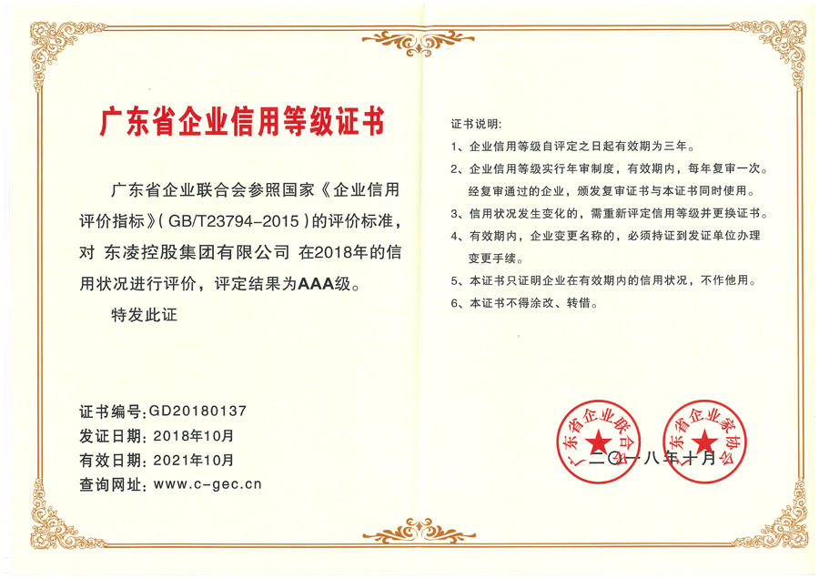 2018年广东省企业信用AAA等级证书